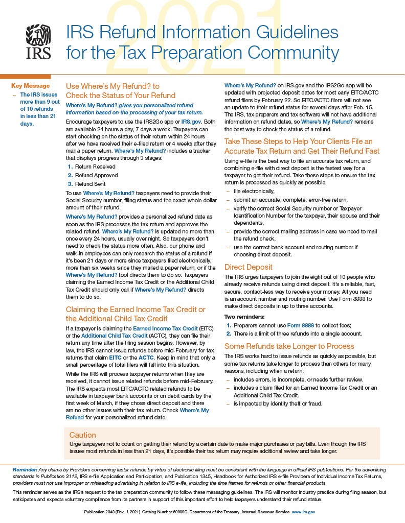 Publication 2043 “IRS E-file Refund Cycle Chart” has been renamed “IRS Refund Information Guidelines for the Tax Preparation Community.” The new Publication 2043 is no longer a chart showing the refund cycle time frames. Instead, it provides guidance for taxpayers to check on their refunds. Taxpayers can also go on the IRS website and search “Where’s My Refund” to find information.