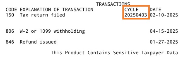 The IRS Cycle Code is an 8-digit number that appears on your Tax Account Transcript under the “Cycle” column next to various transactions.